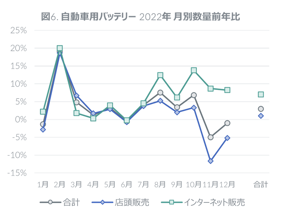 2022年の国内自動車用バッテリー市場は数量前年比3.0%増と微増であった(図6)。月別にみると、前年より気温が低かった2月は販売が急増し、店頭販売では数量前年比18.6%増、インターネット販売では同20.0%増に達した。ただ、店頭販売では需要の最盛期である11月、12月に前年を下回ったことで、通年では数量前年比1.0%増にとどまった。