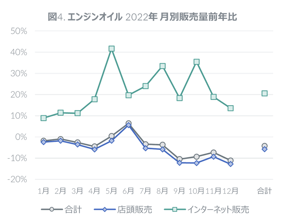 2022年の国内エンジンオイル市場は販売量前年比4.2%減と微減であった。店頭販売では6月を除く各月で前年を下回り、通年で同5.8%減であったことに対し、インターネット販売ではすべての月でプラス成長を見せ、結果、通年で同20.6%増と二桁成長を遂げた(図4)。