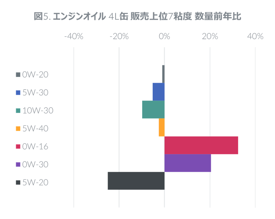 4L缶では0W-20の販売が最も多く数量ベースで41.9%を占めたが、前年からは1.0%減と販売を落とす結果となった。他方、0W-16は数量前年比32.4%増、0W-30は同20.5%増と大幅な伸長を見せた(図5)。