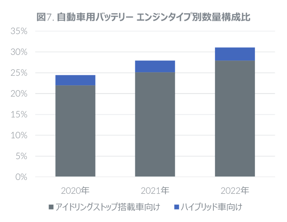 エンジンタイプ別では、ハイブリッド車向けとアイドリングストップ搭載車向けのバッテリーが好調で、数量前年比はそれぞれ16.6%増、14.5%増と二桁成長を遂げた。数量構成比ではハイブリッド車向けが3.2%、アイドリングストップ搭載車向けが27.9%と、合計で31.1%に至った(図7)。