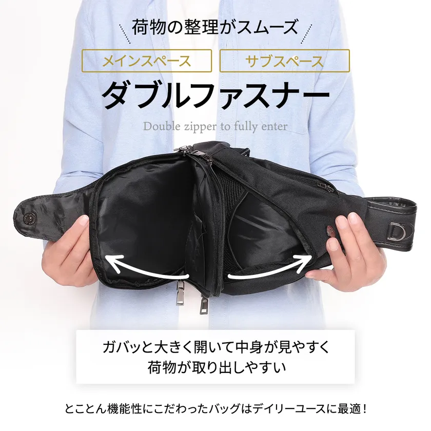 ・メインスペース、サブスペースには左右どちらからも開けられるダブルファスナーを使用。フロントからガバッと開けば、左右から落ちる心配もなくお財布や小物を取り出せます。