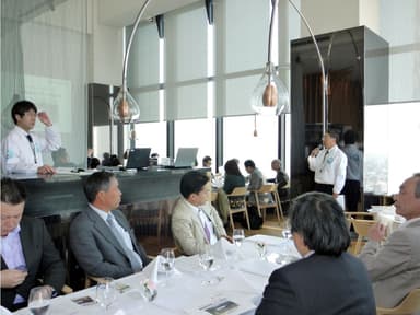 懇談会は、総勢30名の報道関係者様にお集まりいただき、当市からは、農林水産部長、見せる課スタッフをはじめ、メニューに使用された農作物の生産者も参加。会場では奥田シェフのトークセッションなども行われ、交流を深めました。