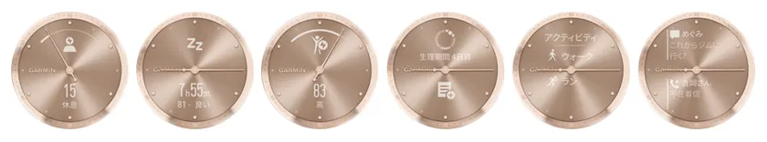 左から、ストレススコア、睡眠スコア、Body Battery、生理周期、アクティビティメニュー、通知機能