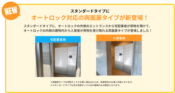 オートロック付きの新築物件に最適なタイプになります。扉が宅配ボックスの表裏両面で開くので宅配業者はエントランスからオートロックを解錠しなくても荷物を預けることができ、入居者はオートロックの内側の入居者エリアから荷物を受け取ることができるようになります。