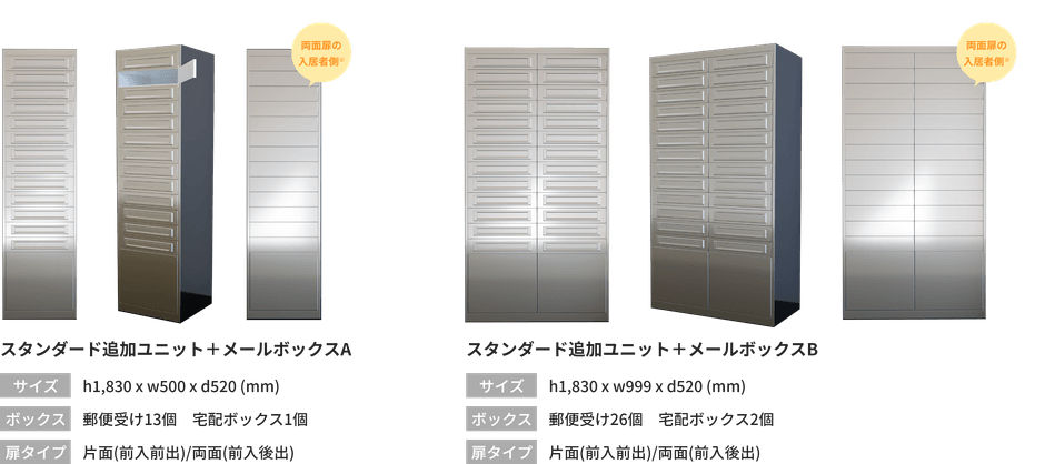 郵便受け一体型モデルはスタンダード追加ユニット+メールボックスA(h1,830 x w500 x d520 mm)とスタンダード追加ユニット+メールボックスB(h1,830 x w999 x d520 mm)の2型を展開しています。スタンダードタイプの追加用の宅配ボックスとして導入いただけます。