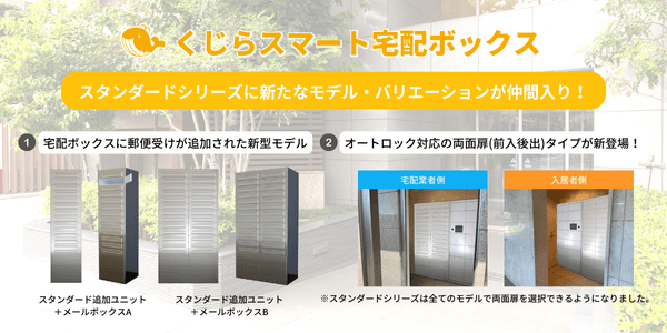 くじらスマート宅配ボックスに郵便受け一体型のNEWモデルが新登場!新築用の両面扉タイプも追加され導入可能な物件の幅が広がりました!