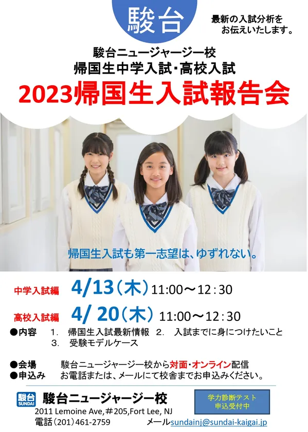 駿台ニュージャージー校では、3月~4月にかけて帰国生入試イベントを複数ご用意しています。