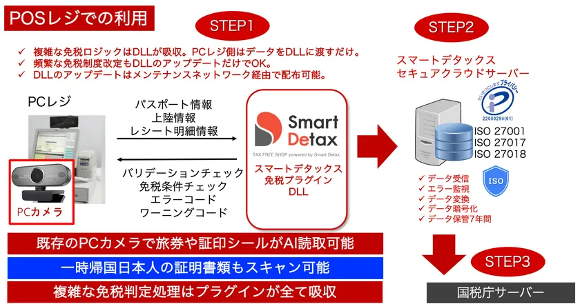 スマート社が提供する免税アプリ【スマートデタックス】および無料配布する【スマートデタックス免税プラグインDLL】は、POSレジに付属したWEBカメラやPCカメラを使って、旅券の国籍ページだけでなく、上陸許可シール(在留資格と入国日が記載されている)や非居住者証明書類(令和5年度に義務化される一時帰国日本人が提示する海外在住証明書または戸籍附票)も瞬時にスキャン、さらに免税金額条件を加味して複雑な免税可否を自動判定し、国税庁サーバーにリアルタイム送信を行います。また、送信データを暗号化し電子保管するなど、免税手続きに必要な全ての機能が、オールインワンで外部モジュール化されます。このプラグインの利用により、ユーザー企業やレジ開発会社においては、下記のような多様なメリットが実現します。