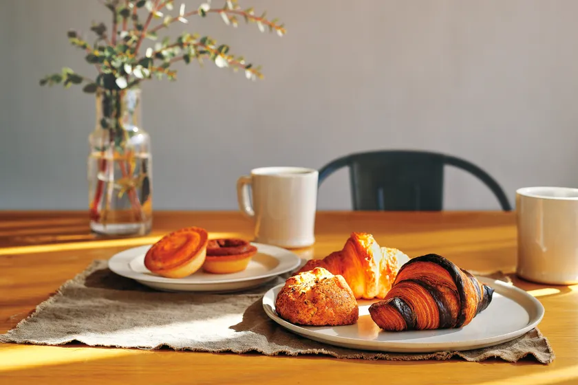 フランス産の2種類の小麦粉をブレンドした生地にフランス産発酵バターを折り込み、外はパリッ、中はしっとり焼き上げました。芳醇なバターの香りをお楽しみいただけます。