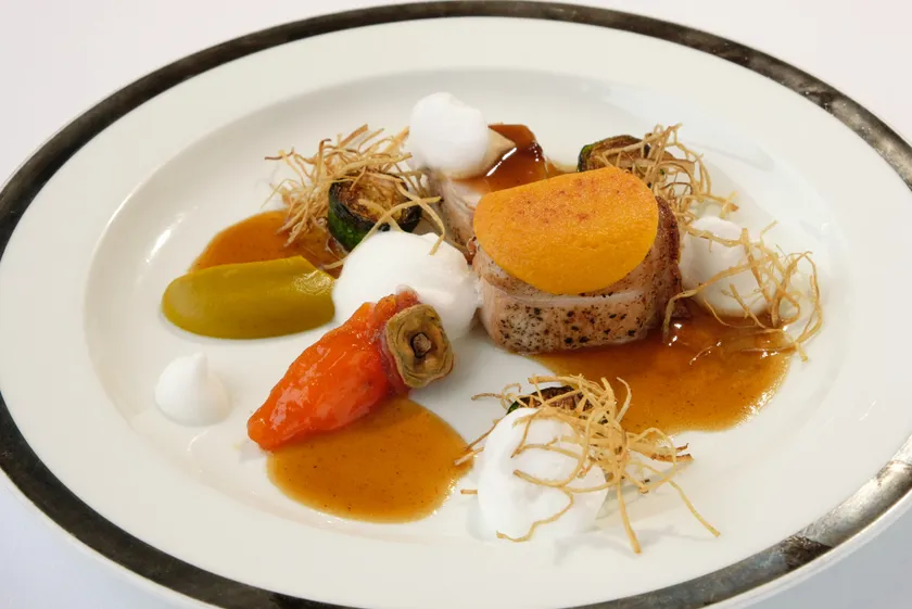 主役のあんぽ柿と好相性の“似たもの同士”を集めた一皿。こんがりと焼き上げた福島県産あぶくま三元豚ロース肉には、あんぽ柿とクリームチーズを練り合わせたクルートをのせて。