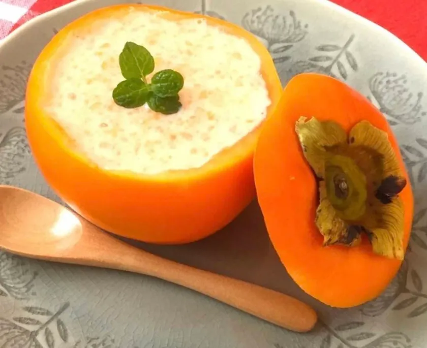 あんぽ柿と牡蠣を、白味噌ベースのソースと共に、くり抜いた柿の器に入れ、オーブンで焼きました。