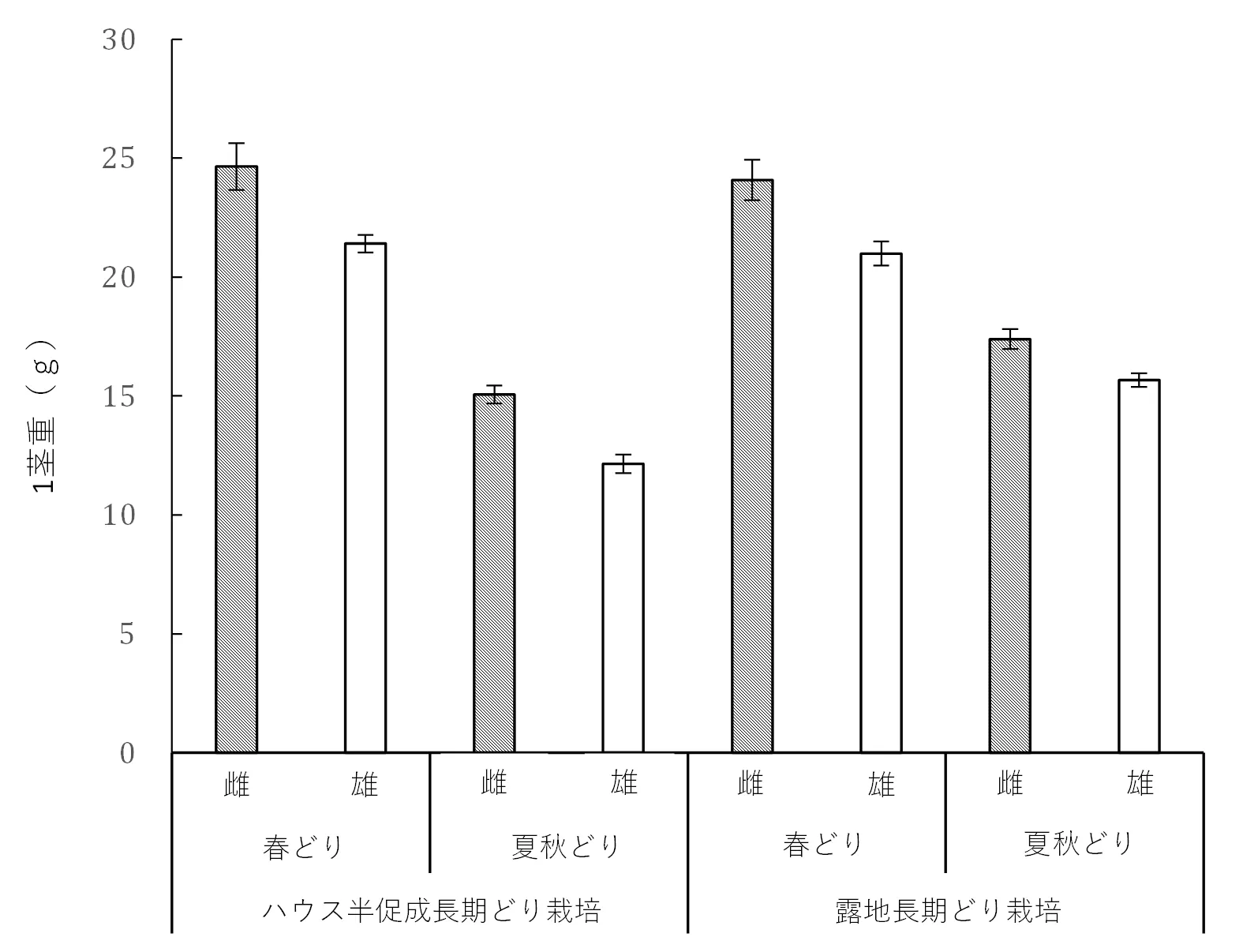 その結果、露地長期どり栽培およびハウス半促成長期どり栽培の2つの長期作型において、1茎重および収量は雌株が雄株と同等か有意に高く、雌株の利用により単価の高い太いアスパラガスの収量が増える可能性が示唆されました。