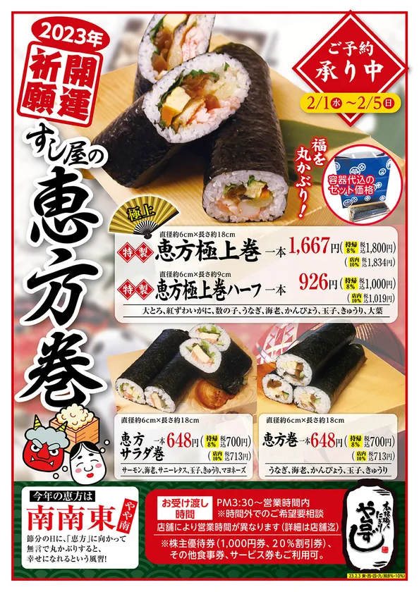 株式会社ヨシックスホールディングス(所在地:愛知県名古屋市、代表取締役:吉岡 昌成、東証プライム・名証プレミア)の飲食事業子会社である株式会社ヨシックスフーズが運営する本格職人握り寿司居酒屋「や台ずし」で、2023年2月の節分に合わせ、2月1日(水)から2月5日(日)の期間限定で、寿司屋の恵方巻を販売いたします。