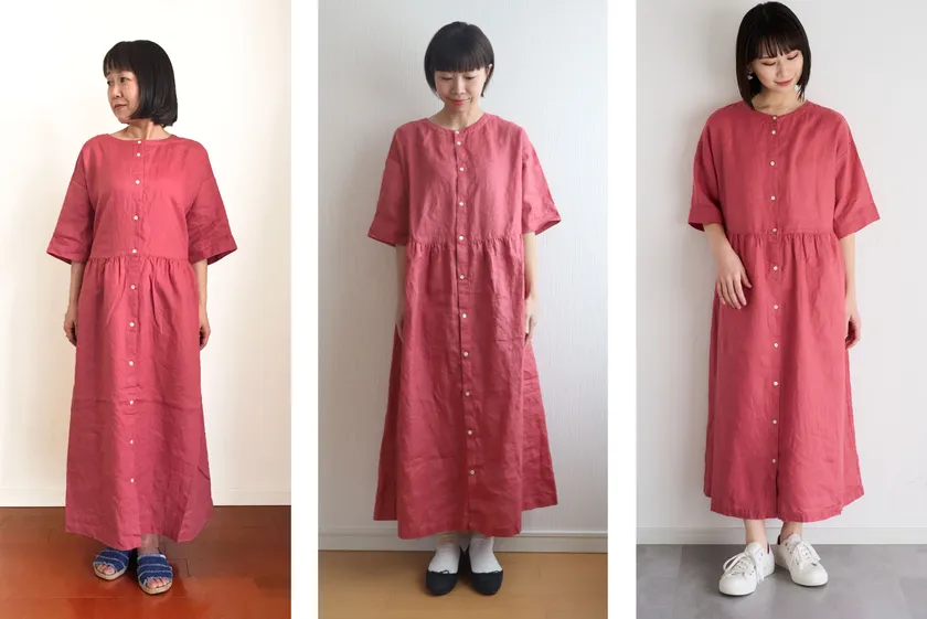 サイズは152cm・157cm・162cmの方に合わせた丈感になっており、袖やウエスト・襟ぐりも着丈に合わせてバランス良く仕上げています。
