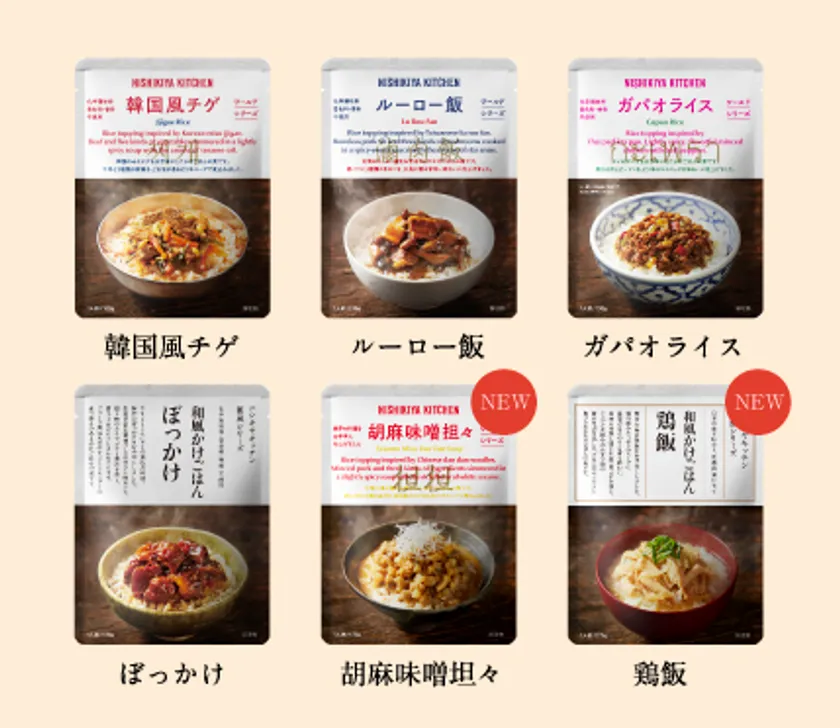 NISHIKIYA KITCHEN(ニシキヤキッチン(株式会社にしき食品、本社:宮城県岩沼市、代表取締役:菊池 洋)は、ごはんにかけるだけで手軽に世界の料理を楽しめるレトルト食品「かけごはん」シリーズより、「鶏飯」と「胡麻味噌坦々」の2品を2023年3月2日(木)に発売します。ニシキヤキッチンの「かけごはん」シリーズはこれまで4種類のラインナップがあり、今回で全6種類となります。