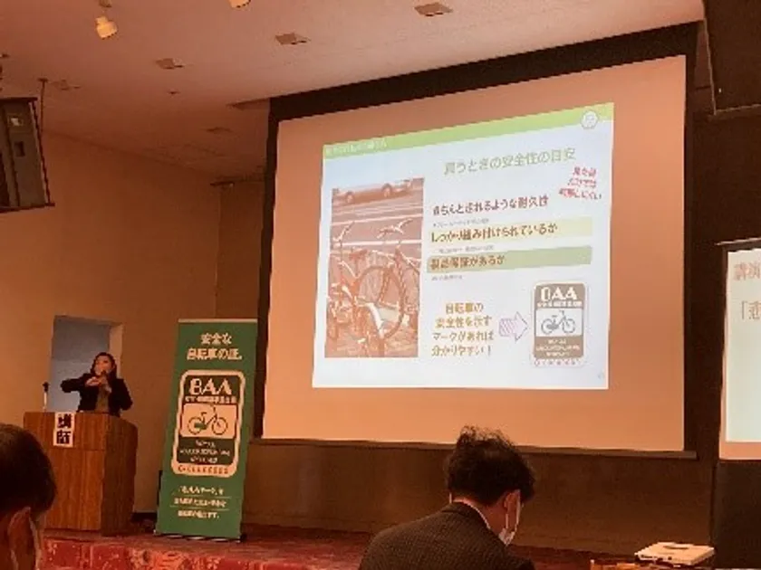 本講演では、高校生の自転車事故の傾向や特徴、事故データに触れ、自転車を取り巻く法律、マナー、学生のリスク予測・技術力の向上のポイント等を挙げ、全国の学校で実際に行われている交通安全の取り組み事例を具体的に紹介しました。講師の遠藤 まさ子(自転車の安全利用促進委員会メンバー/自転車ジャーナリスト)は、「成人に比べ車の運転免許を持っていない高校生は、道路標識等を正しく理解できておらず、道路交通法を前提とした指導が必要です。生徒が加害者になってしまう事故に関して、交通ルールだけではなく、なぜ必要なのかを伝えていくことが重要です。自転車側が弱者とは限らず、事故の加害者になってしまうケースは、リアルな情報を伝えることで、重大さの理解につながります。」と解説しました。さらに、見落としがちな自転車自体の安全性に触れ、「大きな事故の約3分の1は製品にも原因があったと考えられます。90項目以上の厳しい検査に合格した自転車にのみ認定されている、安全基準をクリアしたBAAマークの貼られた自転車を選ぶことで、製品不良による事故を未然に防ぐことができます。また、日ごろのメンテナンスを指導していくことも重要となります。」と説明しました。
