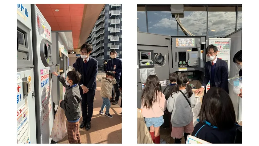 クイズの次は店外のリサイクルステーションで、実際にペットボトルの回収体験を行いました。それぞれのおうちから綺麗に洗って乾かしたペットボトルを持ってきていただき、一人ずつ回収機の中に入れていきます。リサイクルステーションでの説明は、機器メーカーであるトムラ・ジャパン株式会社様につとめていただきました。