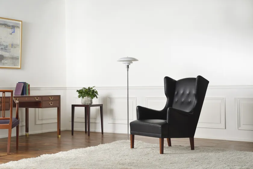 17世紀半ばのデザインが源流となった椅子。クッション構造のベースがコイルバネと天然素材で構成され、肘からつながる両サイドのウィングが頭を支えるため、くつろぎの椅子として重宝される。