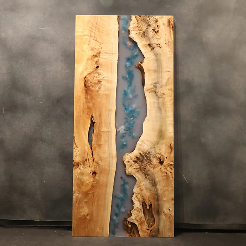木の形、模様、樹皮など様々な表情をもつ木と樹脂のレジンを一体化させた一枚板テーブル。自然と人工を調和させた美しさを味わえる。