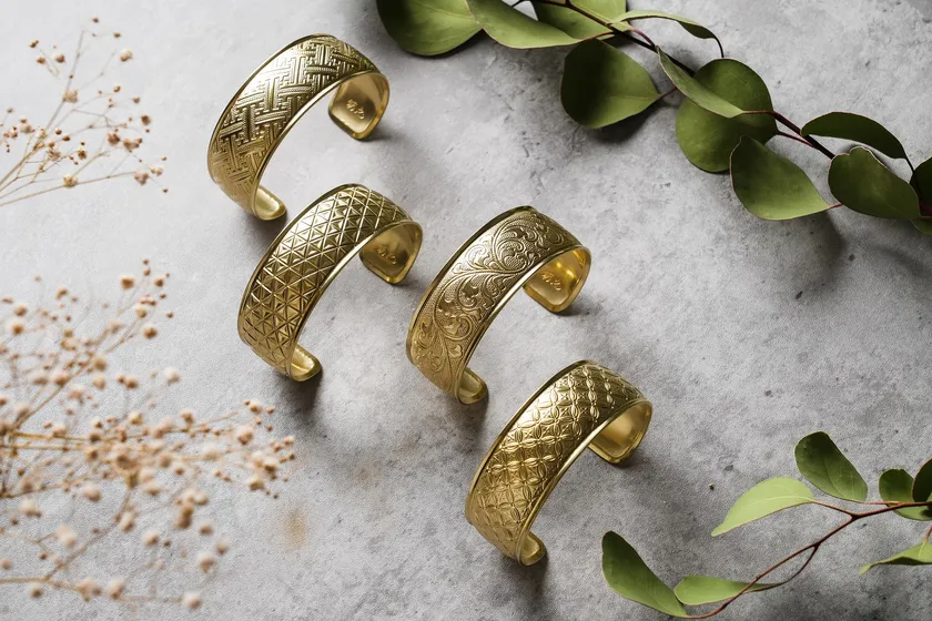 七宝・鱗・唐草・紗綾型(さやがた)の4種類があり、それぞれに平和や繁栄への願いや魔除けの意味が込められています。素材は真鍮で、その持ち味を活かすため、あえてメッキはしておりません。そのため使い込むことで表面が酸化し、経年変化(エイジング)による独特の風合いが生まれてきます。初めは真鍮の上品な光沢を楽しんでいただき、腕に馴染んだ頃には色や風合いが変化し自分だけの逸品になります。ペアでも使用しやすいよう、サイズはSとMの2種類を用意しました。