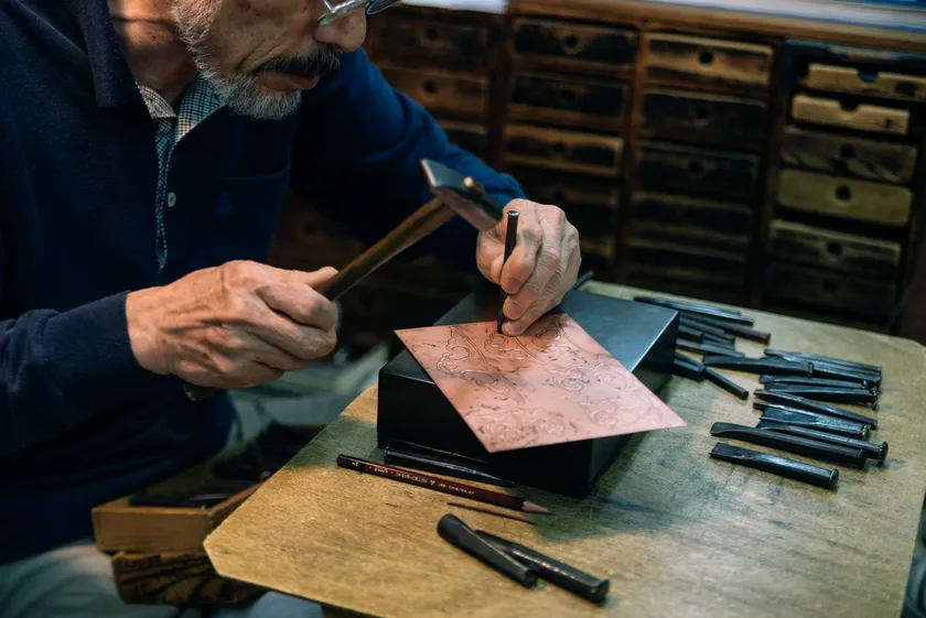 1968年に吊灯篭を製作する会社として京都の地に創業。現在は主に仏壇の錺金具、社寺金物、寺院仏具の製造及び修理を行っている。手彫りの技術と機械の技術を両立させたものづくりをしている。2020年に、錺金具をもっと身近な存在にしたいという思いから、新ブランド「錺之-KAZARINO-」を立ち上げる。