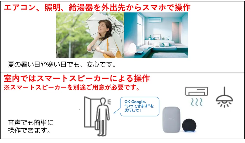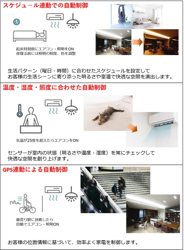 時間に合わせた設定や住む方に快適な温度の自動設定など、シニアの方や小さいお子様がいらっしゃるご家庭、ペットにやさしい住まいなど様ざまなシーンやニーズに合わせることができ、便利で快適な住まいが実現します。将来的には、キッチン設備機器の操作なども追加拡充してまいります。