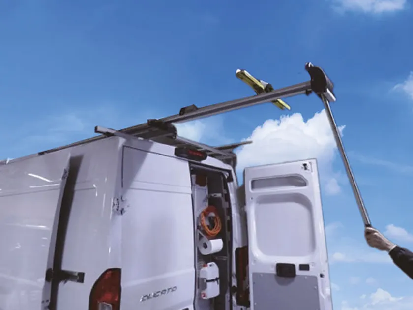 デュカトのルーフラックへのハシゴなどの積み込みは、油圧式バンラックシステムを活用。専用バーで基部を引き下げ、その場でしっかり固定できます。車高が高くても油圧ダンパーでスムーズな昇降が可能です。