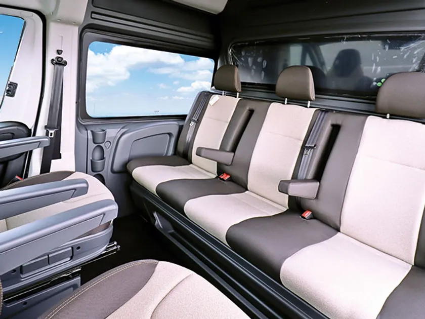 純正シートに合わせたマテリアル、ステッチを使用し細部までこだわったシート。デュカトのボディサイズを生かした設計となっており、ゆったりと乗車できます。また、専用のサイドガラスは大きく、目線の高さも相まって観光バスのような快適な空間を実現。