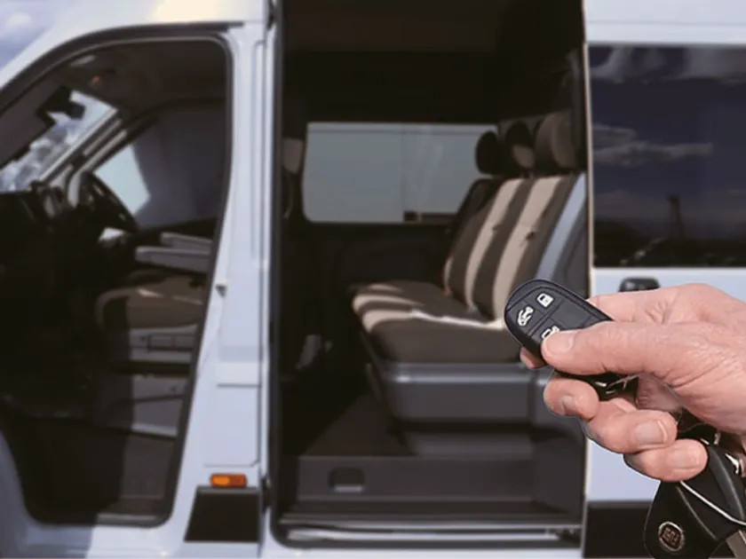 『Veldo』社の電動スライドドアは、純正キーレスリモコンと連動し開閉操作が可能。また、運転席にも開閉スイッチが設置されます。挟み込み防止機能付き。