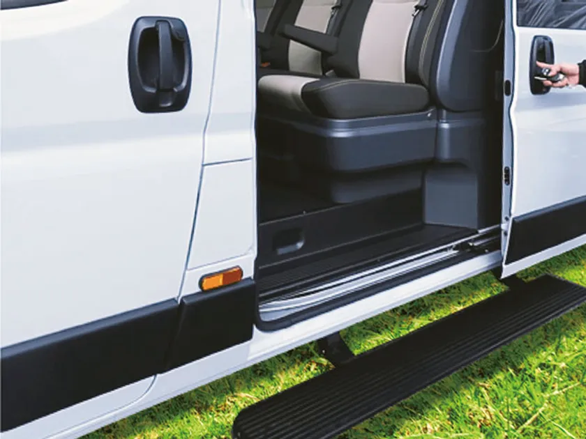 『Veldo』社の電動ステップボードは、先述のスライドドアと連動し、乗降時に便利な電動ステップボードが自動で昇降します。