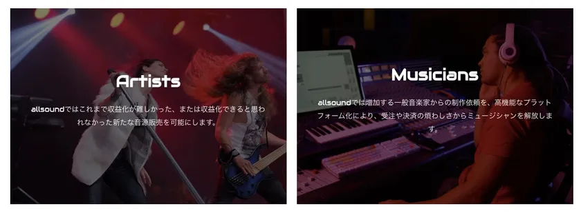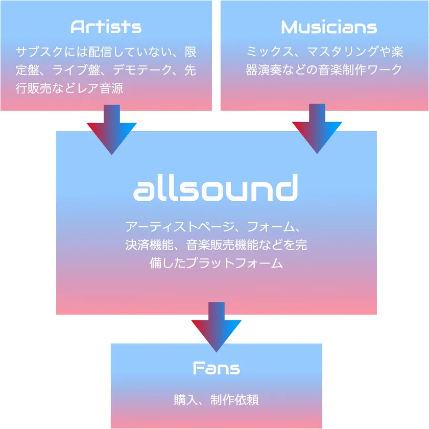 allsoundは、アーティストのサブスクにはないレア音源の購入やミュージシャンに音楽制作依頼ができる新しい音楽プラットフォームです。