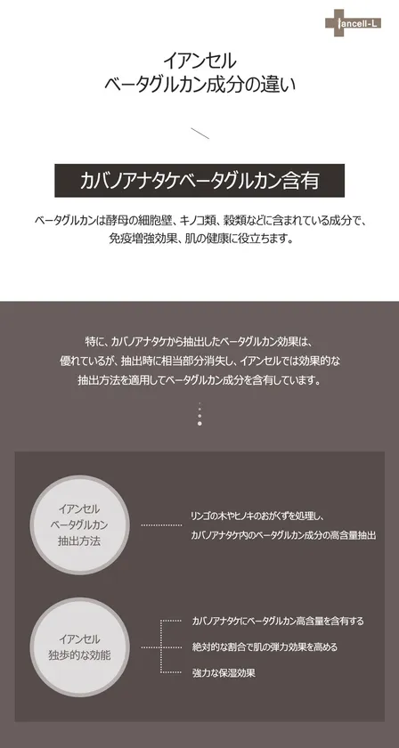 ベータグルカンは酵母の細胞壁、キノコ類、穀類などに含まれている成分で、免疫増強効果、肌の健康に役立ちます。iancell(イアンセル)の製品には一般的なベータグルカンではなく特許を得たベータグルカンが入っています。