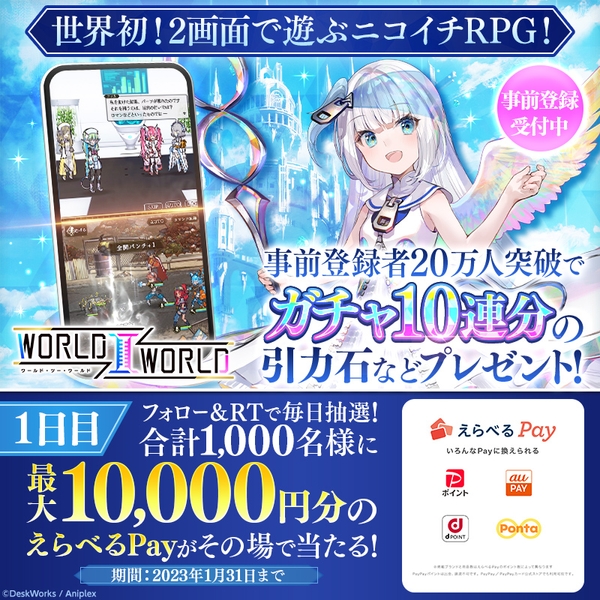 株式会社アニプレックス(本社:東京都千代田区 代表取締役 岩上敦宏 以下アニプレックス)は、今冬配信予定のスマートフォン向けニコイチRPG『World Ⅱ World(ワールド・ツー・ワールド)』(iOS/Android)に関して、冒険の舞台となる「異世界×現代ワールド」の紹介映像を公開しました。また、事前登録をApp Store、予約トップ10、LINEの友だち追加にて開始いたしましたので合わせてお知らせします。