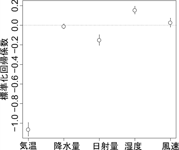 図1. 各気象変数から推定された標準化回帰係数の平均値。0から離れた値であるほど効果が大きいことを意味する。エラーバーは95%信頼区間を表す。