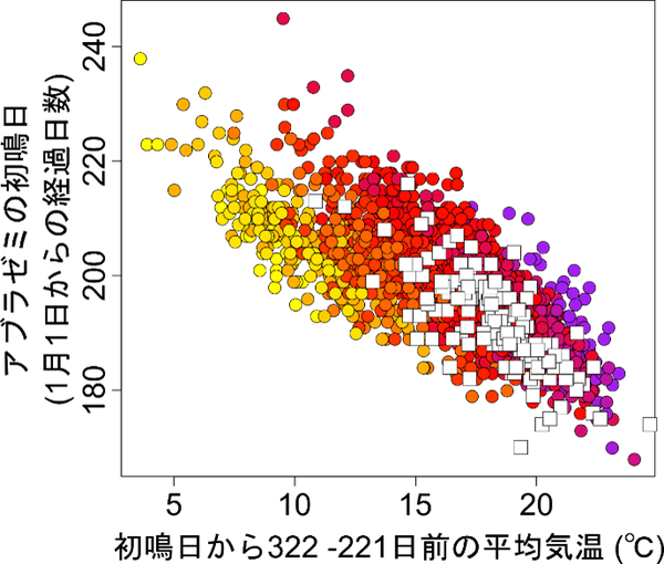 図2. モデル選択法でベストモデルに選ばれた気温変数と初鳴日との関係。〇は2020年以前に観測されたデータで、色の違いは観測場所の違いを表し、□は2021年以降に市民調査員が調べた結果を示している。