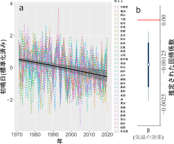 図3.状態空間モデルによる予測結果。(a)状態空間モデルで予測された初鳴日の経年変化。折れ線は各気象台で記録されたアブラゼミの初鳴日の実測データを表し、黒太線は状態空間モデルで予測された初鳴日の予測値を、灰帯はモデルで予測された95%信用区間を表している。(b)推定されたパラメーターの回帰係数の95%信用区間。太・細エラーバーは、それぞれ推定された回帰係数の75パーセンタイル値と95パーセンタイル値を表す。気温の効果が統計的に顕著な負の効果を持っていたことから、気温の上昇が初鳴日を早めていることを意味する。