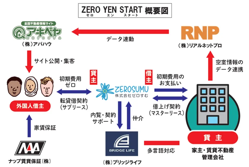 株式会社BridgeLife(ブリッジライフ)は、株式会社アパハウ、株式会社ゼロすむ、ナップ賃貸保証株式会社との提携により、「外国人留学生」や、「外国人労働者」などのインバウンドへ賃貸住宅の提供を行っている家主・賃貸不動産管理会社や、今後、提供を検討している家主・賃貸不動産管理会社に対し、「初期費用0円サービス(ゼロすむ)」、「インバウンド向け賃貸住宅検索サービス(アキベヤ International)」、および、当社が提供している「インバウンド向けコールセンター(外国人コール24)」の3つのサービスが複合した「ZERO YEN START(ゼロエンスタート)」の提供を2023年2月7日(火)に開始いたします。