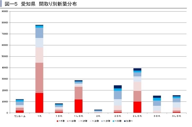 首都圏や関西圏に比較して賃料水準の低い愛知県では、面積の大きい物件の供給が一定量確保されています。間取りとしては、1990年代までは2DKや3DK、3LDKが多く供給されていましたが、2000年以降は1LDKと2LDKに供給の中心が移っています。このため、愛知県の賃貸住宅の間取り別築年分布に示すように、これらの間取りは、ほとんどが築20年以上の築古物件となっています。