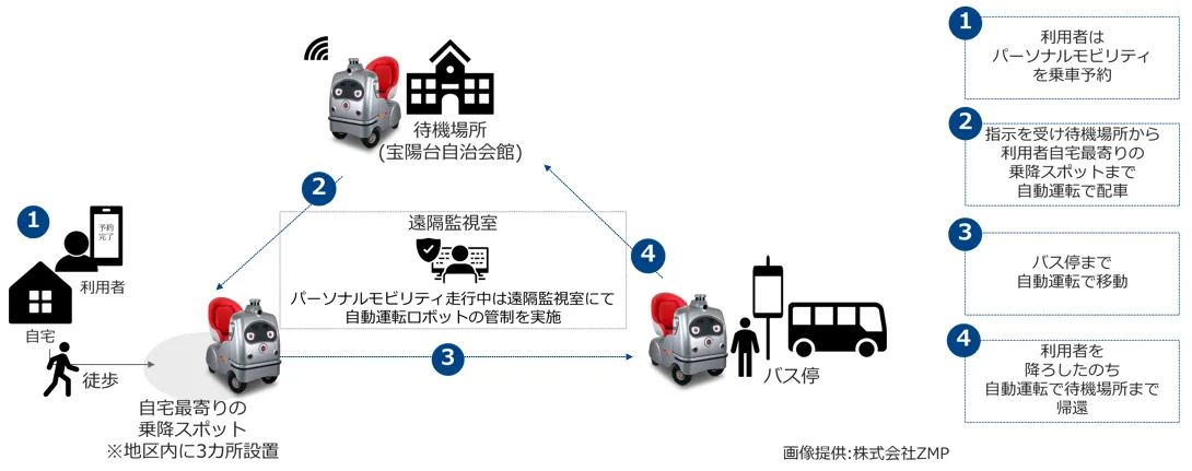 宝陽台自治会館、つくば市宝陽台地区に設置した3か所の乗降場所、バス停間において、遠隔監視型の小型パーソナルモビリティを活用したシェアリングサービスを提供します。利用者は事前に予約し、指定の時間に乗降場所に来ていただくことで利用可能です。