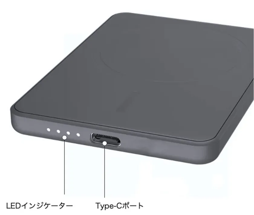 製品コンセプトは「超薄型・名刺カードサイズの軽量コンパクト」設計で、外出時の持ち歩きや装着した時の違和感を最小限にした利便性重視のコンパクトサイズ、ワイヤレスモバイルバッテリーです。