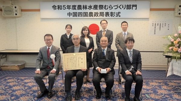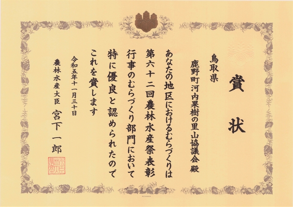 鹿野町河内で取り組んでいる、耕作放棄地を果樹の里山に創り上げるプロジェクトに本学が参画して8年目を迎えています。この度、鹿野町河内果樹の里山協議会が農林水産省主催「令和5年度 豊かなむらづくり全国表彰事業」において農林水産大臣賞を受賞されました。