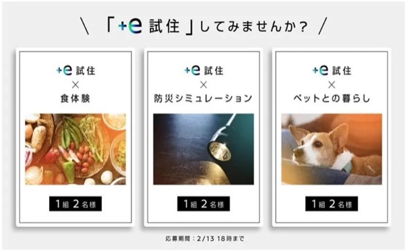 「+e試住」では、実際の住まい環境のご提供だけでなく、「食体験」「防災シミュレーション」「ペットとの暮らし」の3つのテーマを設定し、人にも環境にもやさしい新たな生活スタイルご体感いただける内容を企画しました。2023年2月13(月)18:00までにご応募いただいた中から、抽選で計3組6名様(各テーマ1組2名様)に無償で体験いただきます。