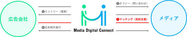 「Media Digital Connect」は、タイアップ広告のプランニングや制作進行のデジタル化を実現する、企業とメディアのマッチングプラットフォームです。企業からのオファーに合わせ、各メディアが企業に直接アイデアを提案できるエントリー機能を搭載しています。