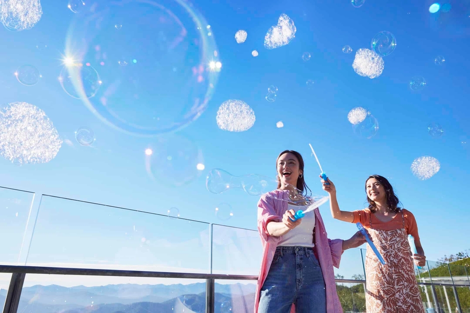 会場となる展望デッキから、スタッフが雲に見立てたシャボン玉(*)を青空に飛ばすクラウドリリースを実施します。これは、ヘリウムガスを使用して、雲に見立てたいくつものシャボン玉を空に飛ばし、青空を彩るセレモニーです。今回は、お客さまにシャボン玉キットを配布。より多くのシャボン玉を青空に飛ばします。シャボン玉は太陽の光で虹色に見え、新たな彩りを添えます。