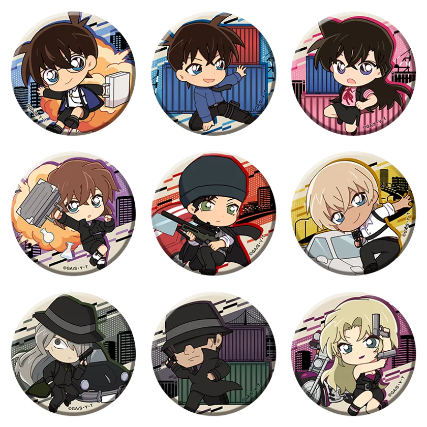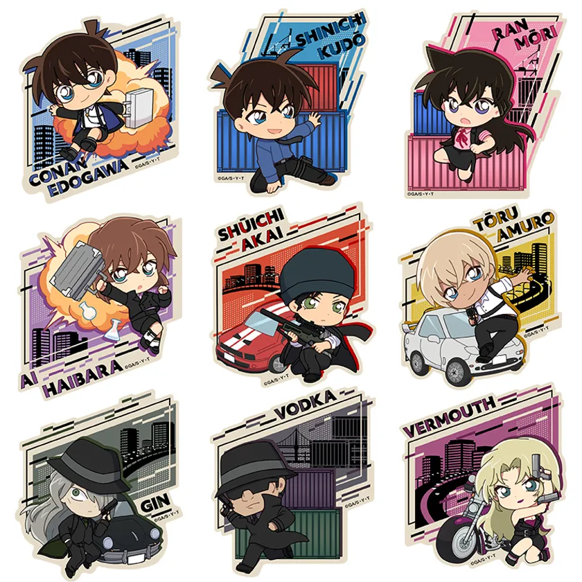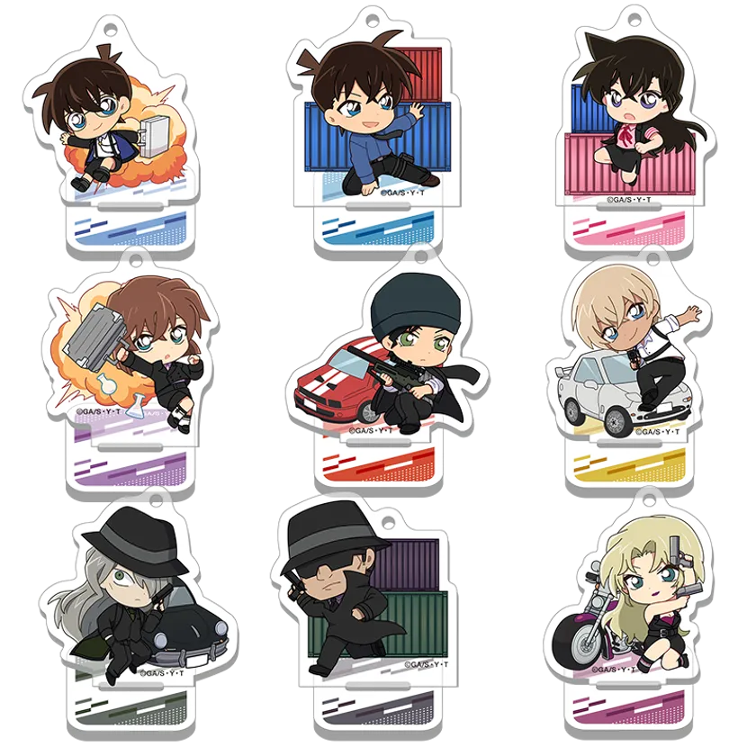 江戸川コナン/工藤新一/毛利蘭/灰原哀/赤井秀一/安室透/ジン/ウォッカ/ベルモットの全9キャラで展開。スパイのような衣装を身にまとい、動きのあるポーズの商品デザインです。