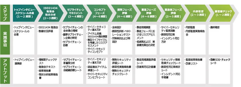 ISO21434規格要求事項の理解から、セキュリティマネジメントシステムの構築、コンセプトフェーズ、開発フェーズ、開発後フェーズの各々における要件の実装支援、審査に向けた最終チェックまでを行います。支援範囲とステップの一例は以下の通りです。