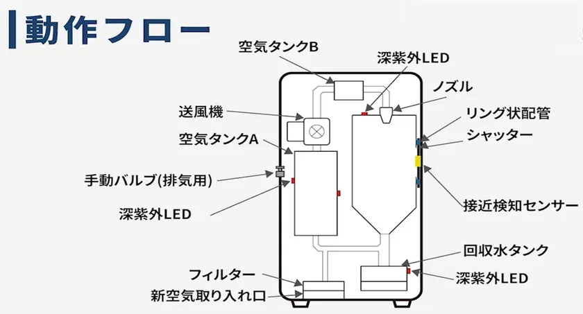(2) 事前に空気タンク内で、深紫外LEDで除菌されたクリーンな空気が手に吹き付けられる