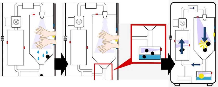 (1)シャッター付きの手挿入空間内で、事前に空気タンク内に設けた深紫外LEDで殺菌されたクリーンな空気を手に吹き付けるため、清潔である。