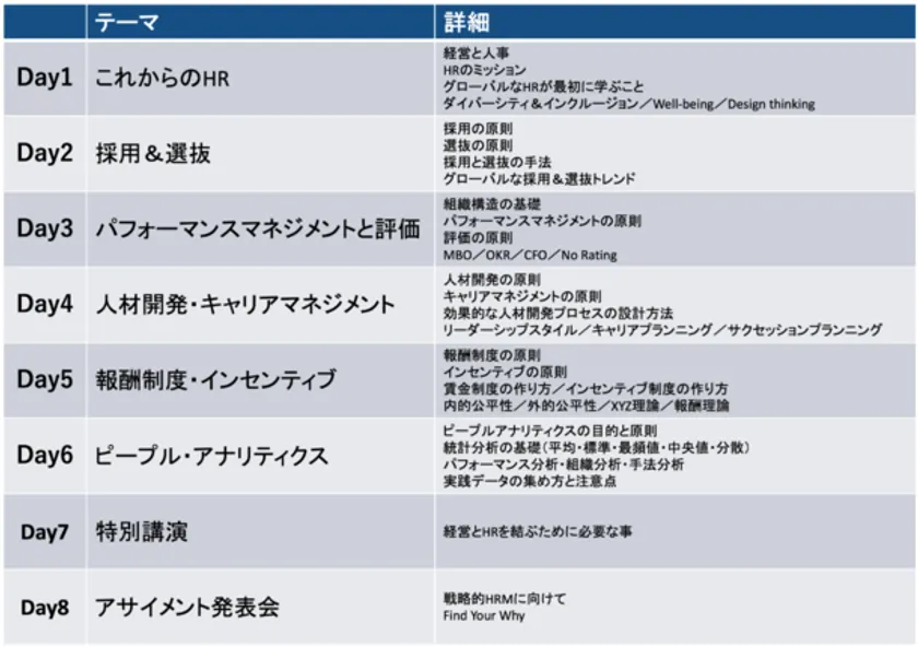 HRBP養成講座は、Day1からDay8までの8講座構成となっており、まず全体像を掴み、HRの各領域をテーマとした講義で理解を深め、特別講演で実践のヒントを得る構成となっています。