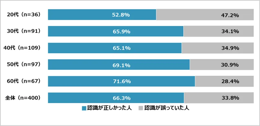 年代別の一致率(正答率)では60代が71.6%と最も高く、最も低かったのは20代で52.8%でした。